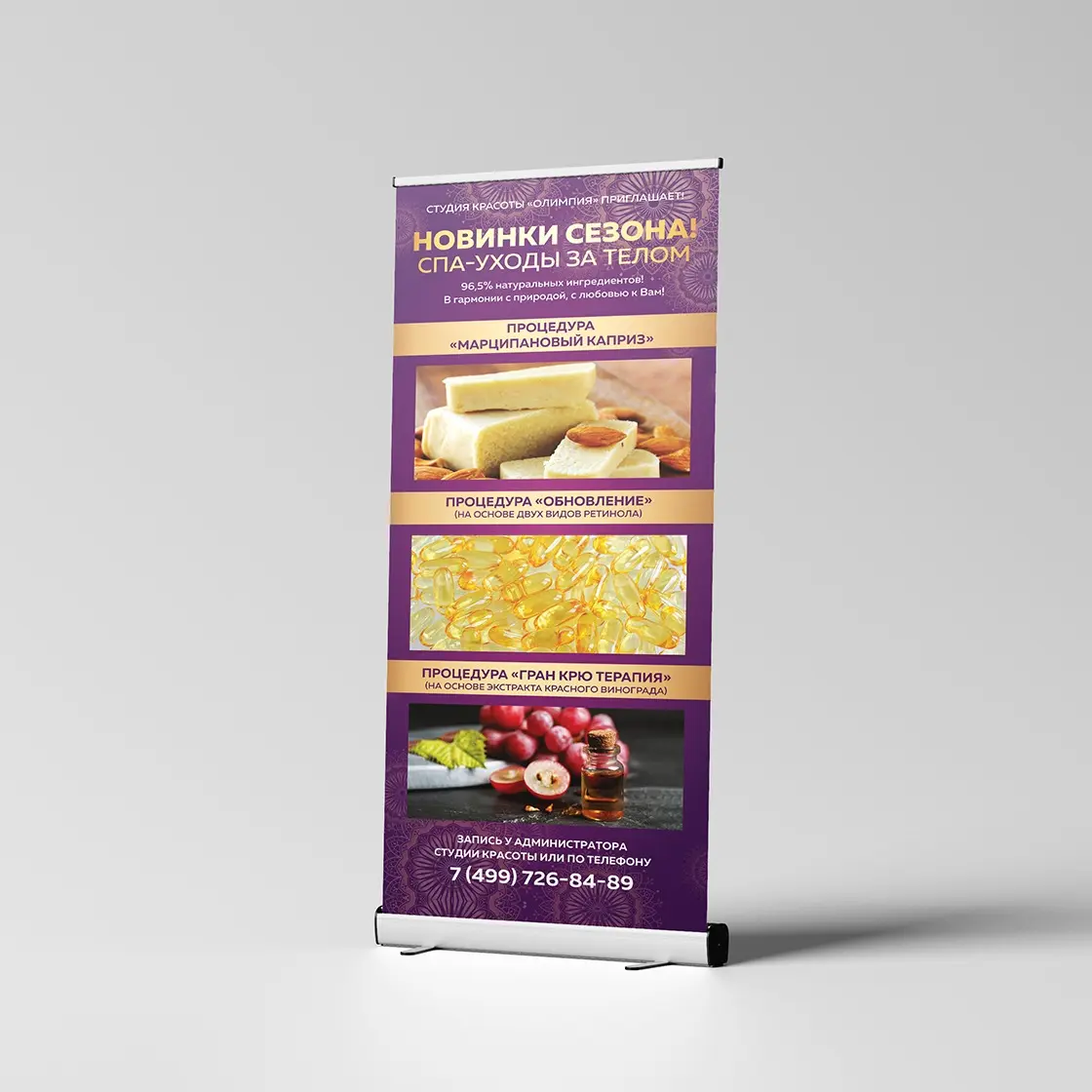 Роллап (или Roll Up, ролл-ап) - это мобильная рекламная конструкция, состоящая из баннера с изображением и встроенного механизма для автоматического сматывания.